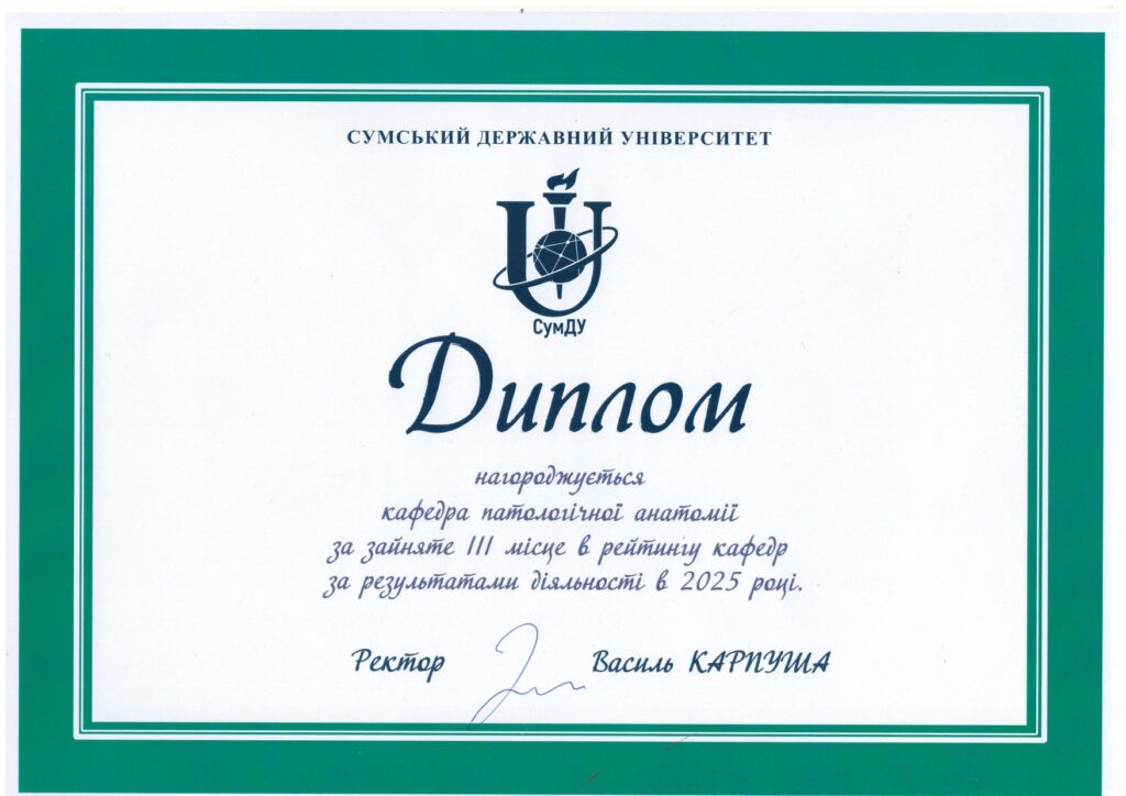 Минулого року ми перемогли у рейтингу структурних підрозділів СумДУ, що стало вінцем нашої 15-річної участі у змаганні та першою (і єдиною) перемогою кафедри Медичного інституту. Хоча тоді і здавалося, що це пік, але результати загальноуніверситетського рейтингу СумДУ за 2025 рік доводять інше: кафедра патологічної анатомії не просто «забігла» на п’єдестал, вона на ньому впевнено оселилася.