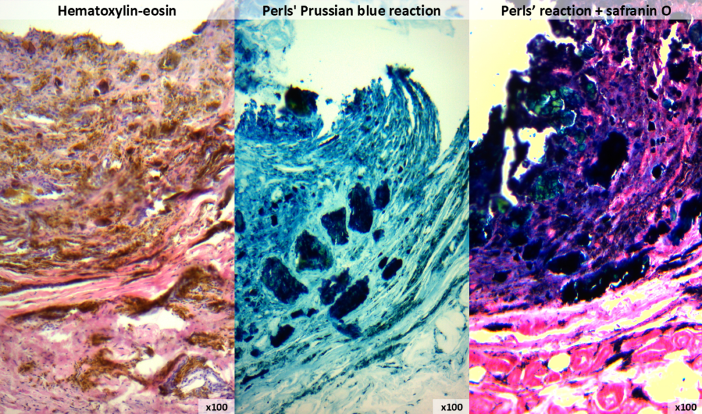 A biopsy of the skin of the finger of an 84-year-old patient with clinical suspicion of melanoma was sent to the histology laboratory. Macroscopically, there was a 2×2 mm area of pigmentation on the skin surface, and a black pigment was visualised on the section. During histological examination, the pathologists suspected that this was not melanoma at all, but rather hemosiderin deposits from an old haemorrhage. But suspicion is not enough, because the patient’s further fate can vary from complete recovery to amputation… Therefore, it was decided to use Perl’s reaction to detect hemosiderin. During this staining, the tissue is treated with solutions of yellow blood salt and hydrochloric acid, as a result of which iron compounds become blue in colour – Prussian blue is formed (yes, the same one you heard about in school chemistry lessons). The first photo shows haematoxylin and eosin staining; the second shows a positive Perls’ reaction; and the third shows additional nuclei stained with safranin O. Now the pathologists were sure this was an old haemorrhage, not melanoma. We express our sincere gratitude to the head of the Department of Theoretical and Applied Chemistry, Lyudmila Ponomaryova, for her help with the reagents!