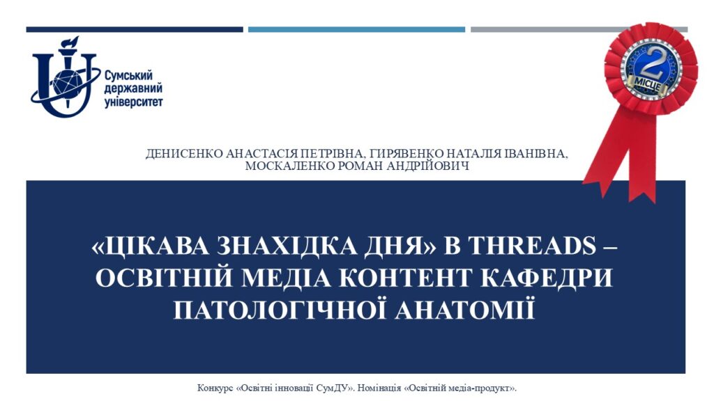 З радістю повідомляємо, що розробка колективу кафедри патологічної анатомії під назвою «Цікава знахідка дня» в THREADS – освітній медіа контент кафедри патологічної анатомії» отримала 2 місце на конкурсі «Освітні інновації СумДУ» у 2025-2026 н.р. у номінації «Освітній медіа-продукт».